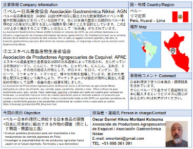 la_en_飲食業 Country Peru la_en_輸入希望 la_en_菓子類・スナック la_en_水産物・冷凍食品 la_en_調味料・惣菜 la_en_調理器具・食器・包装 |