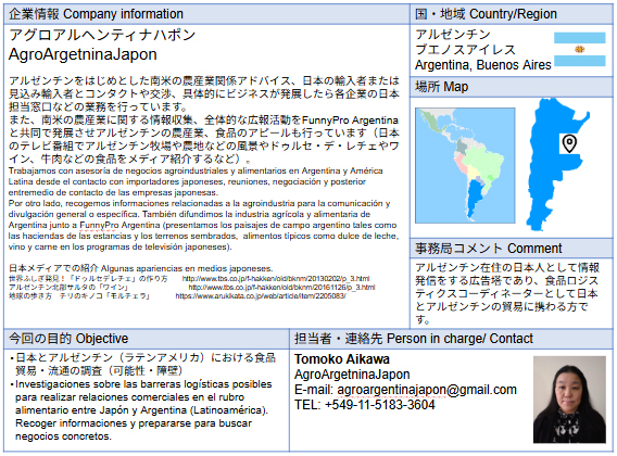 アグロアルヘンティナハポン アルゼンチンをはじめとした南米の農産業関係アドバイス、日本の輸入者または見込み輸入者とコンタクトや交渉、具体的にビジネスが発展したら各企業の日本担当窓口などの業務を行っています。 |