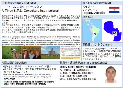 ア・フィネスSRLコンサルタント パラグアイの農業分野のコンサルタントであり、JICA ・ 世界銀行等の国際機関事業の経験が豊富で、日本とパラグアイのビジネスの架け橋になることを目的とします。当社は全く異なる経歴を持った3名が2008年に設立し、当初からパラグアイだけでなくその他の南米南部共同市場メルコスール加盟国のバリューチェーンの発展に働きかける事業を手掛けてきました。今では異なる国や分野のコンサルタント20名との提携を結んでいます。 ![]() |