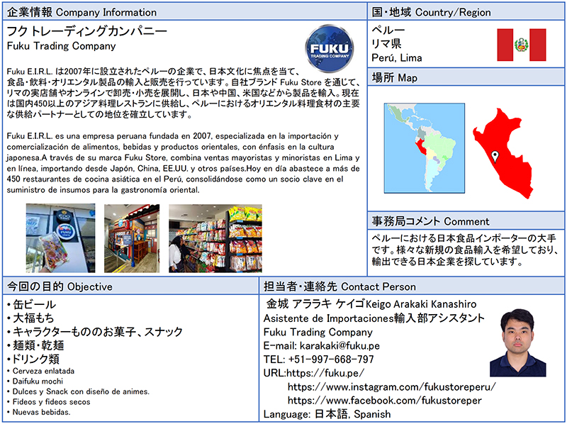 ![]() フク トレーディングカンパニー Fuku E.I.R.L. は2007年に設立されたペルーの企業で、日本文化に焦点を当て、食品・飲料・オリエンタル製品の輸入と販売を行っています。自社ブランド Fuku Store を通じて、リマの実店舗やオンラインで卸売・小売を展開し、日本や中国、米国などから製品を輸入。現在は国内450以上のアジア料理レストランに供給し、ペルーにおけるオリエンタル料理食材の主要な供給パートナーとしての地位を確立しています。 ![]() |