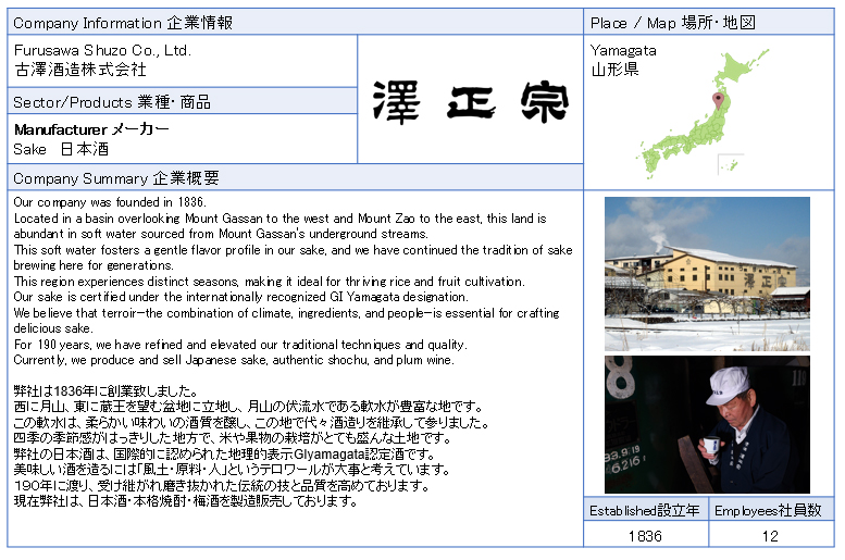 ![]() Furusawa Shuzo Co., Ltd. Our company was founded in 1836. For 190 years, we have refined and elevated our traditional techniques and quality. ![]() |