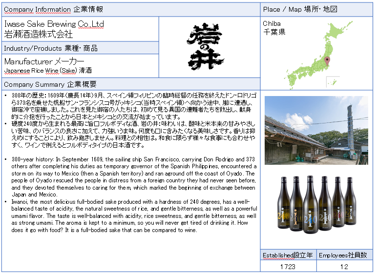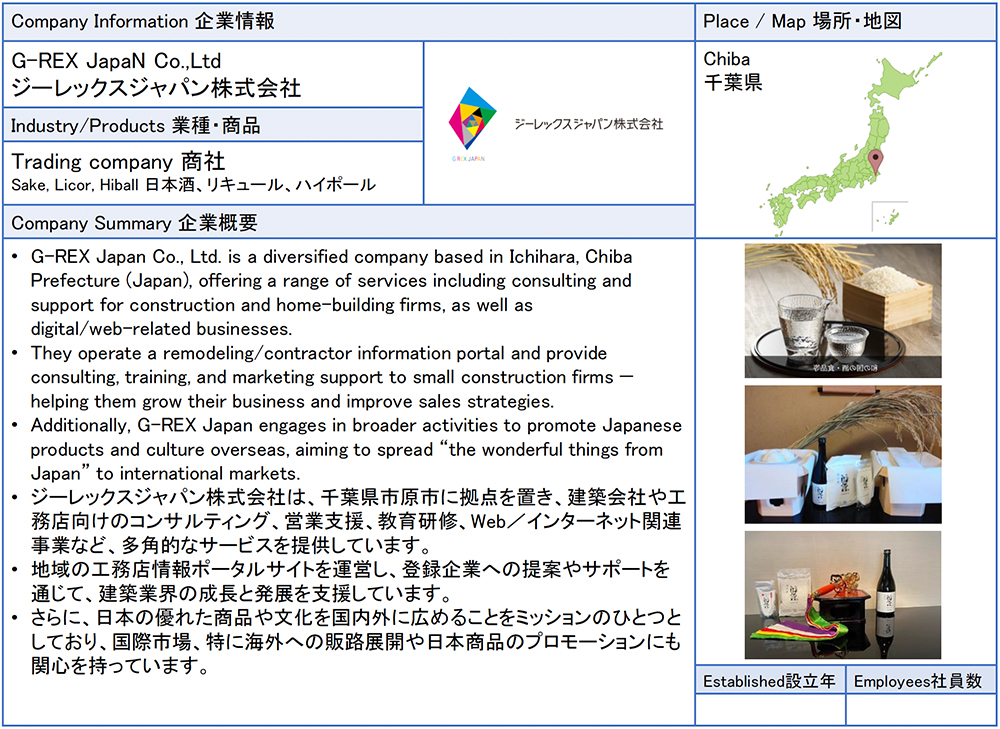 ![]() G-REX JapaN Co.,Ltd G-REX Japan Co., Ltd. is based in Ichihara City, Chiba Prefecture. One of our missions is to spread Japan's excellent products and culture both domestically and internationally, and we are interested in expanding sales channels and promoting Japanese products in international markets. We handle everything from sake and liqueurs to food ingredients such as rice and we carry a wide range of alcoholic beverages, from standard to premium, including kosher products. We can also propose merchandising with original labels. We have participated in the Japan Festival in Sao Paulo, Brazil twice. We also handle books introducing Japanese culture. ![]() ![]() ![]() ![]() ![]() |