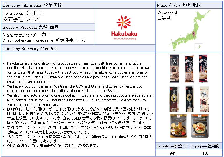 ![]() Hakubaku Co.,Ltd. Hakubaku has a long history of producing salt-free soba, salt-free somen, and udon noodles. Hakubaku selects the best buckwheat from a specific prefecture in Japan known for its water that helps to grow the best buckwheat. Therefore, our noodles are some of the best in the world. Our soba and udon noodles are popular in most supermarkets and great restaurants across Japan. ![]() |