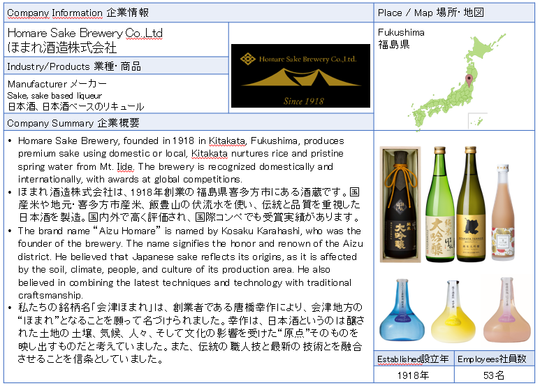 ![]() Homare Sake Brewery Co.,Ltd Homare Sake Brewery Co., Ltd. is a sake brewery located in Kitakata City, Fukushima Prefecture, founded in 1918. Using domestically grown rice, rice from the local Kitakata City, and underground water from Mt. Iide, they produce sake that emphasizes tradition and quality. ![]() ![]() ![]() |