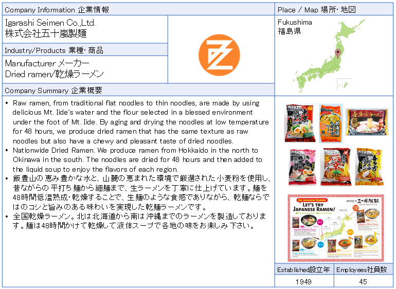 ![]() 株式会社五十嵐製麺 飯豊山の恵み豊かな水と、山麓の恵まれた環境で厳選された小麦粉を使用し、昔ながらの平打ち麺から細麺まで、生ラーメンを丁寧に仕上げています。麺を48時間低温熟成・乾燥することで、生麺のような食感でありながら、乾麺ならではのコシと旨みのある味わいを実現した乾麺ラーメンです。 ![]() ![]() |