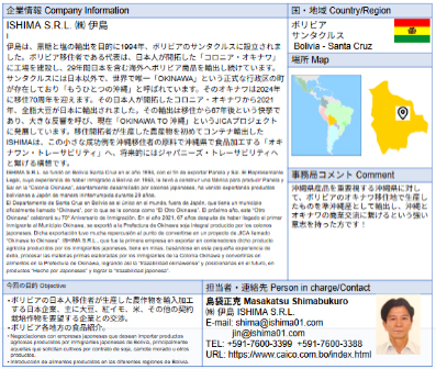 ISHIMA S.R.L. ISHIMA S.R.L. se fundó en Bolivia Santa Cruz en el año 1994, con el fin de exportar Panela y Sal. El Representante Legal, cuya experiencia de haber inmigrado a Bolivia en 1963, le llevó a construir una fábrica para producir Panela y Sal en la “Colonia Okinawa”, asentamiento desarrollado por colonos japoneses, ha venido exportando productos bolivianos a Japón de manera ininterrumpida durante 29 años. |