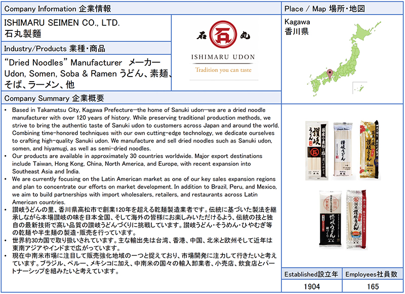 ![]() 石丸製麺 讃岐うどん・そうめん・ひやむぎなどの乾麺や半生麺の製造・販売を行っている。本場讃岐の味を全国、そして海外の皆様にお楽しみいただけるよう、讃岐伝統の技と独自の最新技術で高い品質の讃岐うどんづくりに挑戦しています。 ![]() ![]() |