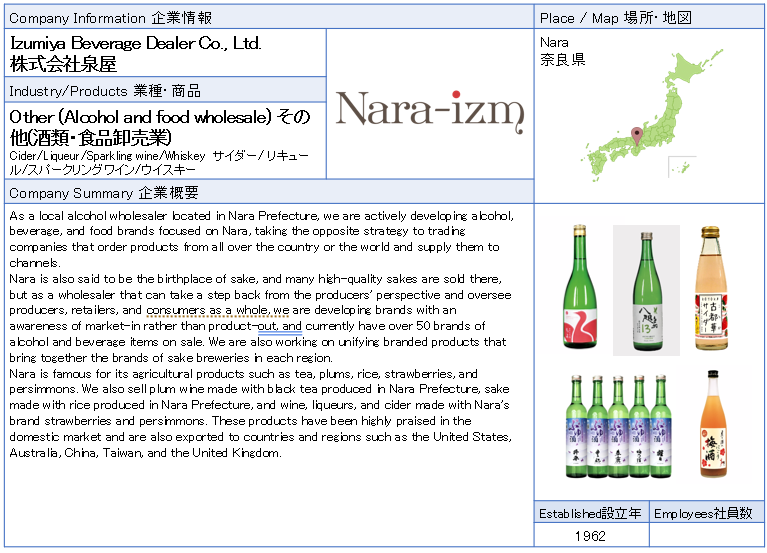 ![]() Izumiya Beverage Dealer Co., Ltd. As a local alcohol wholesaler located in Nara Prefecture, we are actively developing alcohol, beverage, and food brands focused on Nara, taking the opposite strategy to trading companies that order products from all over the country or the world and supply them to channels. ![]() ![]() ![]() ![]() ![]() |