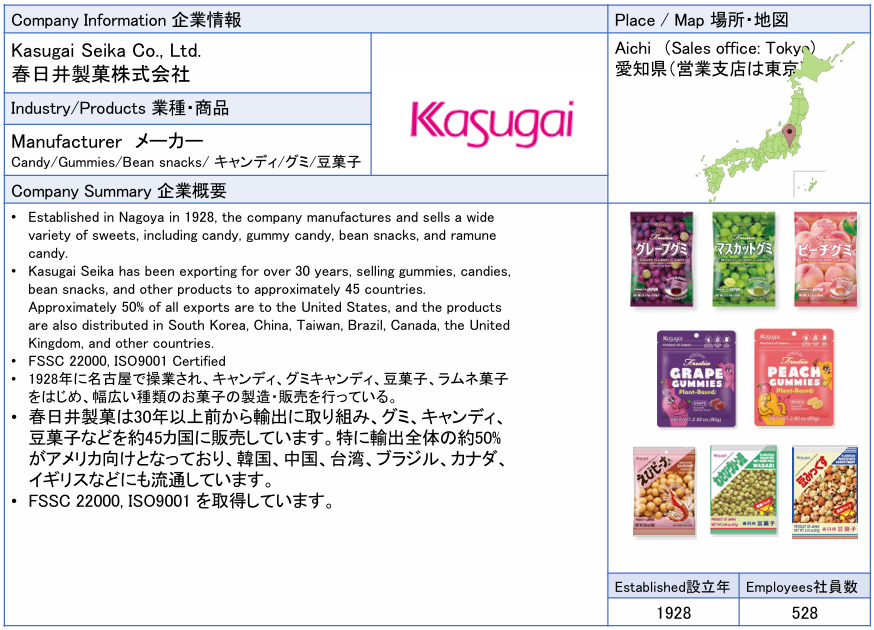![]() Kasugai Seika Co., Ltd. Kasugai Seika has been exporting for over 30 years, selling gummies, candies, bean snacks, and other products to approximately 45 countries. Approximately 50% of all exports are to the United States, and the products are also distributed in South Korea, China, Taiwan, Brazil, Canada, the United Kingdom, and other countries. ![]() ![]() ![]() |