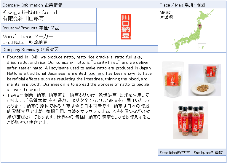 ![]() Kawaguchi-Natto Co., Ltd. Founded in 1949, we produce natto, natto rice crackers, natto furikake, dried natto, and rice. Our company motto is "Quality First," and we deliver safer, tastier natto. All soybeans used to make natto are produced in Japan. ![]() ![]() ![]() ![]() ![]() |