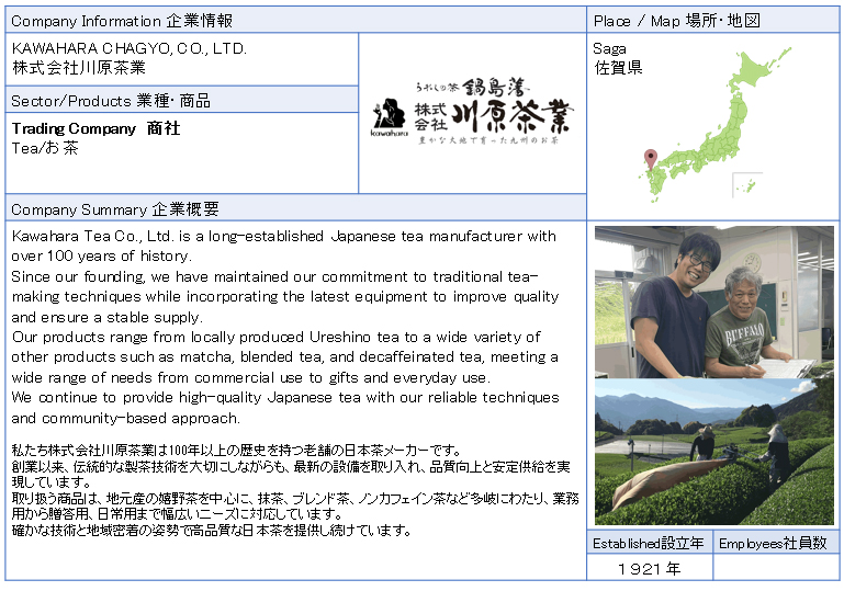 ![]() KAWAHARA CHAGYO, CO., LTD. Kawahara Tea Co., Ltd. is a long-established Japanese tea manufacturer with over 100 years of history. ![]() ![]() ![]() |