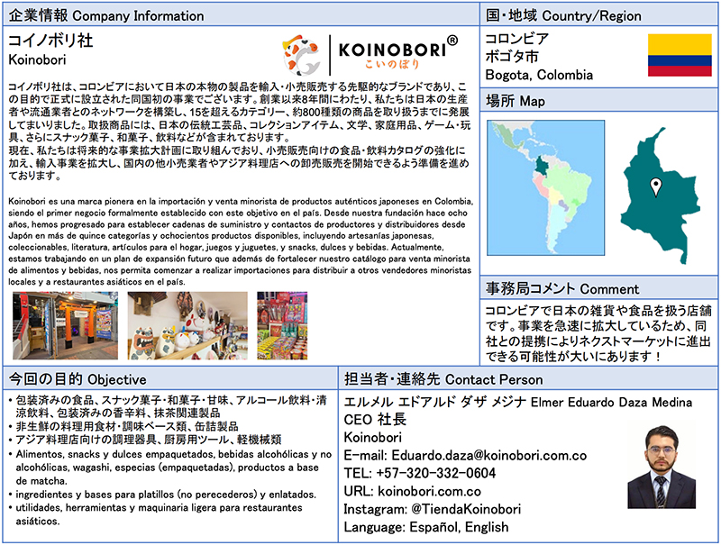 ![]() コイノボリ社 コイノボリ社は、コロンビアにおいて日本の本物の製品を輸入・小売販売する先駆的なブランドであり、この目的で正式に設立された同国初の事業でございます。創業以来8年間にわたり、私たちは日本の生産者や流通業者とのネットワークを構築し、15を超えるカテゴリー、約800種類の商品を取り扱うまでに発展してまいりました。取扱商品には、日本の伝統工芸品、コレクションアイテム、文学、家庭用品、ゲーム・玩具、さらにスナック菓子、和菓子、飲料などが含まれております。 ![]() |