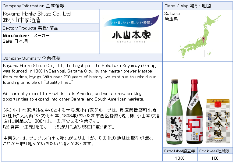 ![]() Koyama Honke Shuzo Co., Ltd. Koyama Honke Shuzo Co., Ltd., the flagship of the Sekaitaka Koyamaya Group, was founded in 1808 in Sashiogi, Saitama City, by the master brewer Matabei from Harima, Hyogo. With over 200 years of history, we continue to uphold our founding principle of “Quality First.” ![]() |