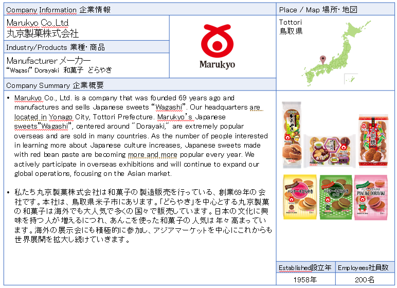 ![]() Marukyo Co.,Ltd. Marukyo Seika Co., Ltd. is a company that was founded 69 years ago and manufactures and sells Japanese sweets. Our headquarters are located in Yonago City, Tottori Prefecture. Marukyo Seika's Japanese sweets, centered around "Dorayaki," are extremely popular overseas and are sold in many countries. ![]() ![]() ![]() ![]() ![]() ![]() |