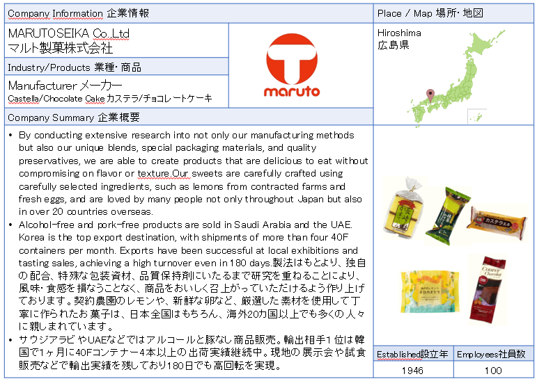 ![]() Marutoseika Co.,Ltd Through extensive research into our unique blends, special packaging materials, and quality preservatives, we are able to create delicious products that do not compromise on flavor or texture. Our carefully crafted sweets, made with carefully selected ingredients such as lemons from contracted farms and fresh eggs, are loved by many people not only throughout Japan but also in over 20 countries overseas. ![]() ![]() |