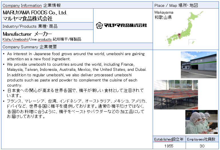 ![]() マルヤマ食品株式会社 フランス、マレーシア、台湾、インドネシア、オーストラリア、メキシコ、アメリカ、ドバイなど、世界各国に梅干を提供しております。通常の梅干だけではなく、各国のお料理に合うように、梅干をペーストやパウダーなどの加工品にしてお届けしております。 ![]() ![]() ![]() ![]() ![]() |