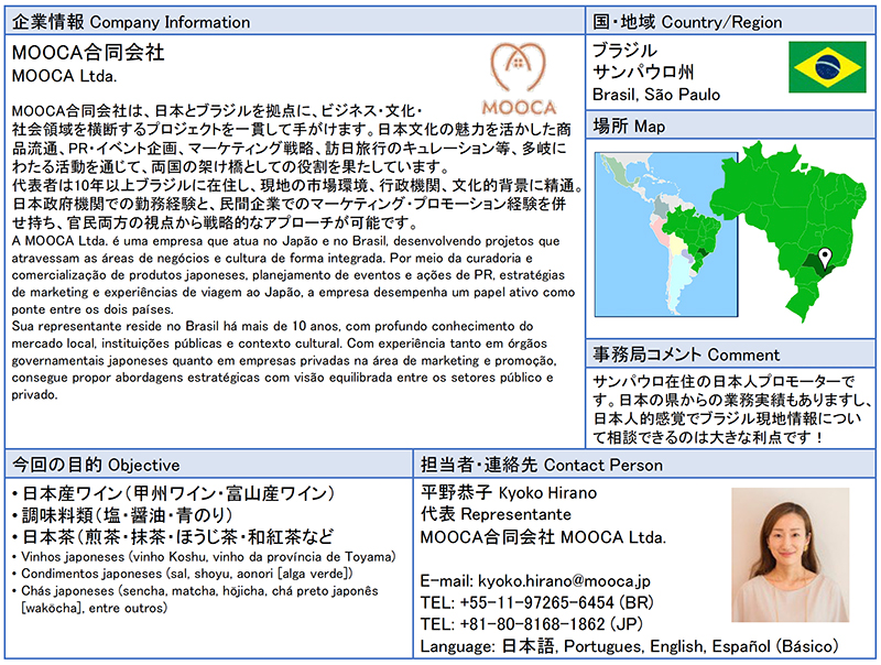 ![]() MOOCA合同会社 MOOCA合同会社は、日本とブラジルを拠点に、ビジネス・文化・社会領域を横断するプロジェクトを一貫して手がけます。日本文化の魅力を活かした商品流通、PR・イベント企画、マーケティング戦略、訪日旅行のキュレーション等、多岐にわたる活動を通じて、両国の架け橋としての役割を果たしています。 |