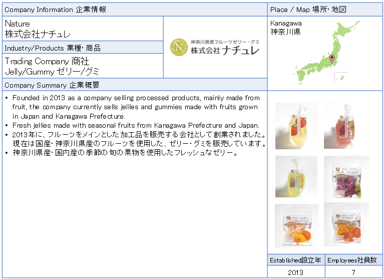![]() Nature Founded in 2013 as a company selling processed products, mainly made from fruit, the company currently sells jellies and gummies made with fruits grown in Japan and Kanagawa Prefecture. Fresh jellies made with seasonal fruits from Kanagawa Prefecture and Japan. ![]() ![]() ![]() ![]() ![]() ![]() |