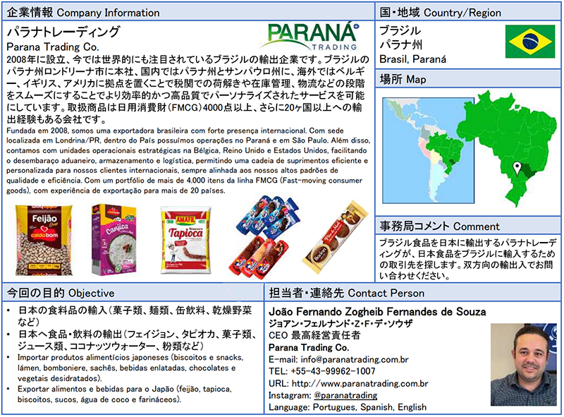 ![]() パラナトレーディング 2008年に設立、今では世界的にも注目されているブラジルの輸出企業です。ブラジルのパラナ州ロンドリーナ市に本社、国内ではパラナ州とサンパウロ州に、海外ではベルギー、イギリス、アメリカに拠点を置くことで税関での荷解きや在庫管理、物流などの段階をスムーズにすることでより効率的かつ高品質でパーソナライズされたサービスを可能にしています。取扱商品は日用消費財(FMCG)4000点以上、さらに20ヶ国以上への輸出経験もある会社です。 ![]() |