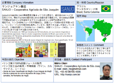 ![]() サンジョアキン農協 SANJOは1993年に34の果樹農家が集まってできた農協で、組合員のほとんどが日系人です。現在では104の組合員と61の准組合員で構成され、約1300haの面積で年間4.5万tのリンゴを栽培するブラジル最大のリンゴ専門の農協です。現在では、リンゴ100%ジュースを年間68万L、炭酸ジュース350ml缶を年間1.4万L、リンゴシードルを年間3500L販売しています。販売できる量しか加工していませんが、工場は年間リンゴ100%ジュース99万L、炭酸リンゴジュース4万L、シードル1万Lまで生産できる能力があります。 ![]() |