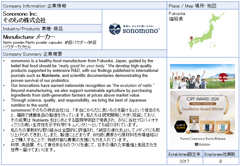 ![]() Sonomono Inc. sonomono is a healthy-food manufacturer from Fukuoka, Japan, guided by the belief that food should be “really good for your body.” We develop high-quality products supported by extensive R&D, with our findings published in international journals such as Nutrients, and scientific documentaries demonstrating the proven survival of our probiotics. ![]() |