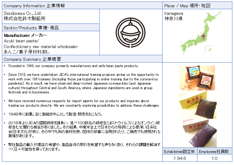 ![]() 株式会社鈴木製餡所 1948年に創業。主に製餡を中心として製造・販売をおこなう。弊社製品の輸入代理店の希望や、製品自体の取引を希望する声も多くあり、それらの課題を解消すべく日々可能性を探っております。 ![]() |