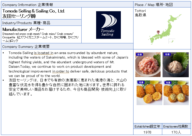 ![]() Tomoda Selling & Sailing Co., Ltd. Tomoda Sailing is located in an area surrounded by abundant nature, including the waters of Sakaiminato, which is blessed with some of Japan's highest fishing yields, and the abundant underground waters of Mt. Daisen.Today, we continue to work on product development and technological improvement in order to deliver safe, delicious products that we can be proud of to the world. ![]() ![]() ![]() ![]() ![]() |