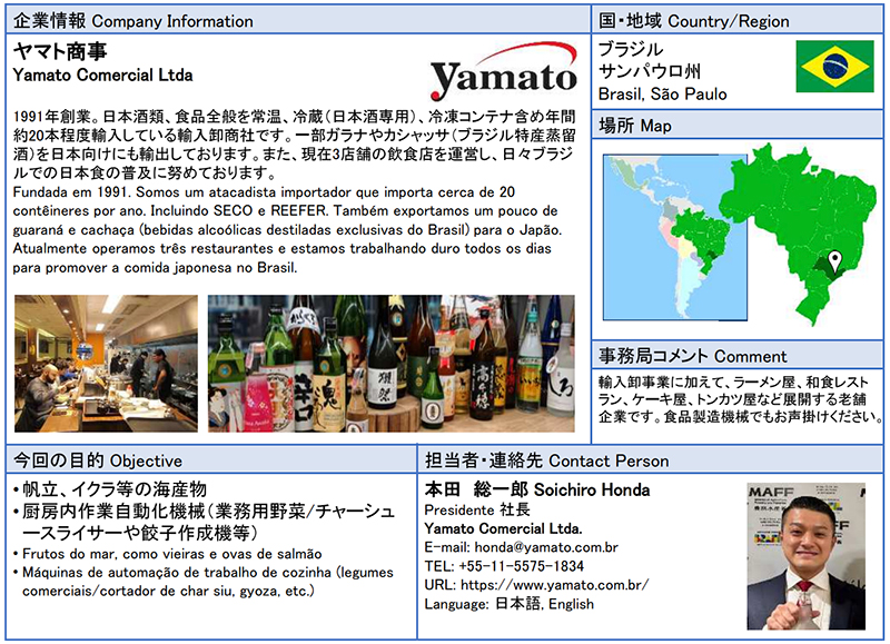 ![]() ヤマト商事 1991年創業。日本酒類、食品全般を常温、冷蔵(日本酒専用)、冷凍コンテナ含め年間約20本程度輸入している輸入卸商社です。一部ガラナやカシャッサ(ブラジル特産蒸留酒)を日本向けにも輸出しております。また、現在3店舗の飲食店を運営し、日々ブラジルでの日本食の普及に努めております。 ![]() |