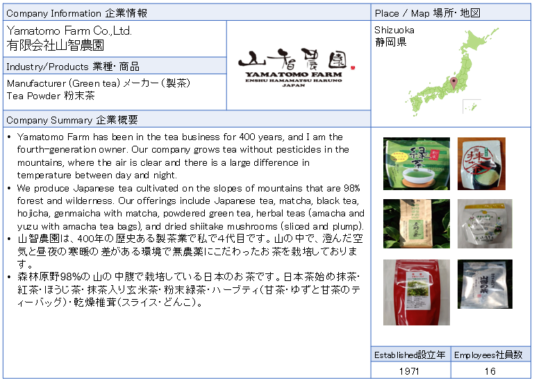 ![]() Yamatomo Farm Co.,Ltd. Yamatomo Farm has been in the tea business for 400 years, and I am the fourth-generation owner. Our company grows tea without pesticides in the mountains, where the air is clear and there is a large difference in temperature between day and night. ![]() ![]() ![]() ![]() ![]() ![]() |