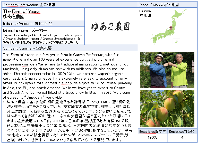 ![]() ゆあさ農園 ゆあさ農園は国内2位の梅の産地である群馬県で、5代100年に渡り梅の栽培と梅干し加工をおこなっている、家族経営の農家です。梅干しは梅と塩以外無添加の、伝統的な製造方法にこだわっています。2014年に日本の有機認証である有機JASを取得しました。 ![]() ![]() ![]() ![]() |