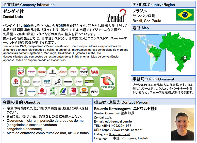 ![]() ゼンダイ社 ゼンダイ社は1999年に設立され、今年25周年を迎えます。私たちは輸出入業社として食品や調理関連商品を取り扱っており、例として日本市場でもメジャーな永谷園や丸美屋・八海山・藤正・フタバなどの商品の輸入を行っています。輸入品の販売先としては、日本食レストラン、日本式コンビニエンスストア、スーパーマーケットや卸売業者が挙げられます。 ![]() |